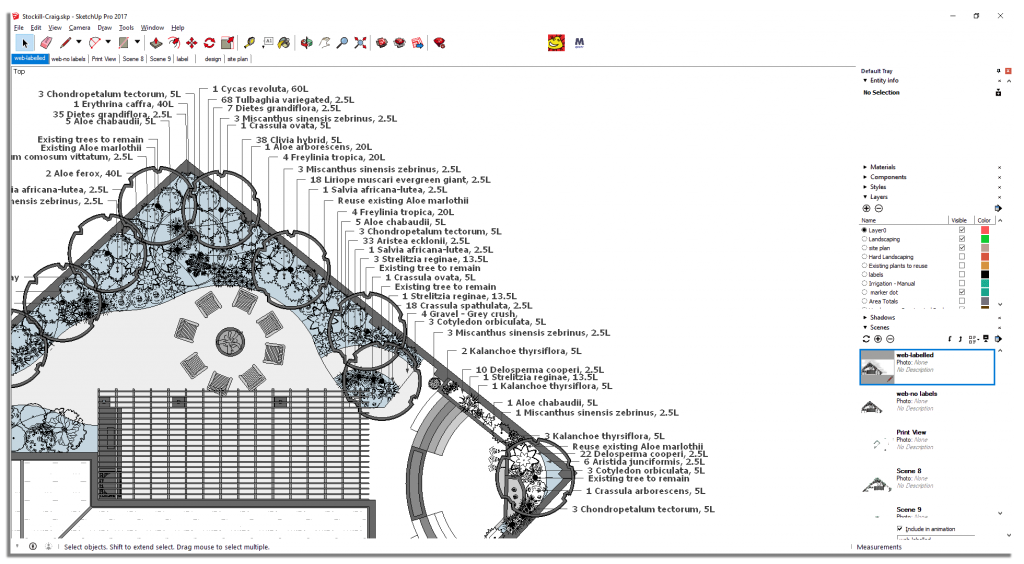 SketchUp provides an incredibly powerful design platform for landscape designers and landscape architects. Simply design your landscape using one of the templates included with QuoteMINDER – these templates are designed for creating 2D designs within the SketchUp environment in order to draw detailed and accurate landscape designs which quantify the different plants and other items required for installation.